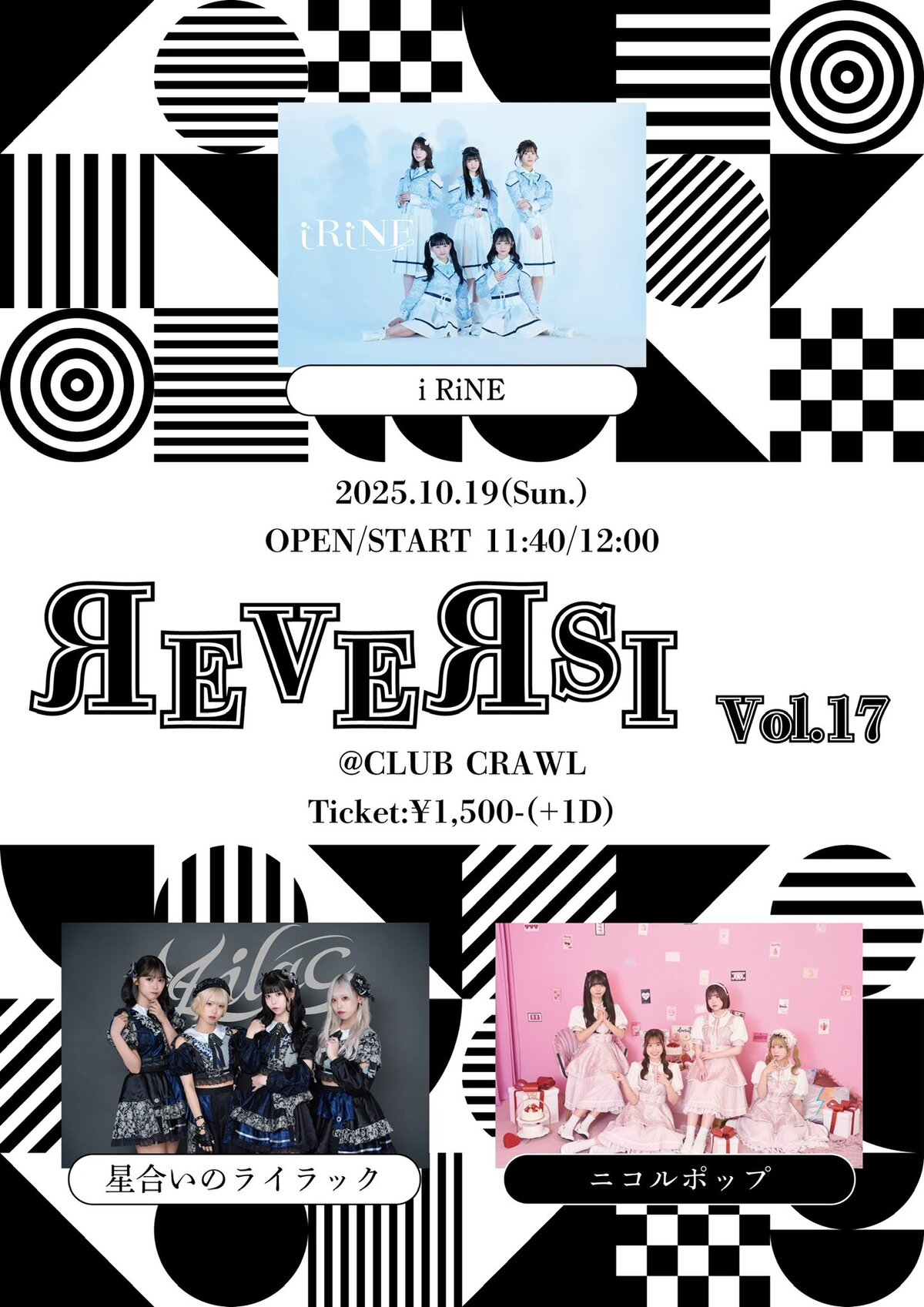 Schedule BACK TO LIST 2025.10.19[Sun] ① CLUB CRAWL 『 REVERSI 』 『 REVERSI 』Vol.17 10/19(日) CLUB CRAWL 開場11:40 / 開演12:00 1,500円 (+1D) https://t.co/ZRpC2JStiQ VENUE ① CLUB CRAWL TIME 開場 / 0:00 開演 / 0:00 TICKET 前売 未定 / 当日 未定 ACT