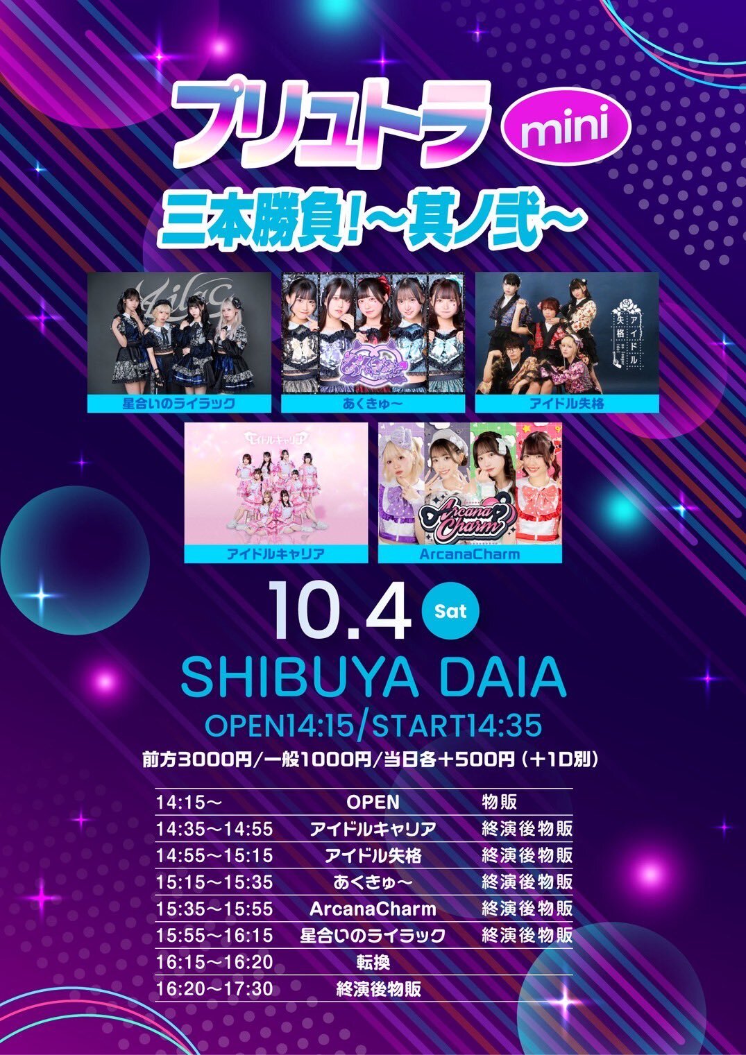 Schedule BACK TO LIST 2025.10.4[Sat] 渋谷DAIA 『 プリュトラmini三本勝負!〜其ノ弐〜 』 10/4(土) SHIBUYA DAIA 15:55〜16:15 16:20〜17:30 OPEN14:15 / START14:35 前方3,000円 / 一般1,000円 / 当日各+500円 (+1D別) t-dv.com/2pltr1004 VENUE 渋谷DAIA TIME 開場 / 0:00 開演 / 0:00 TICKET 前売 未定 / 当日 未定 ACT