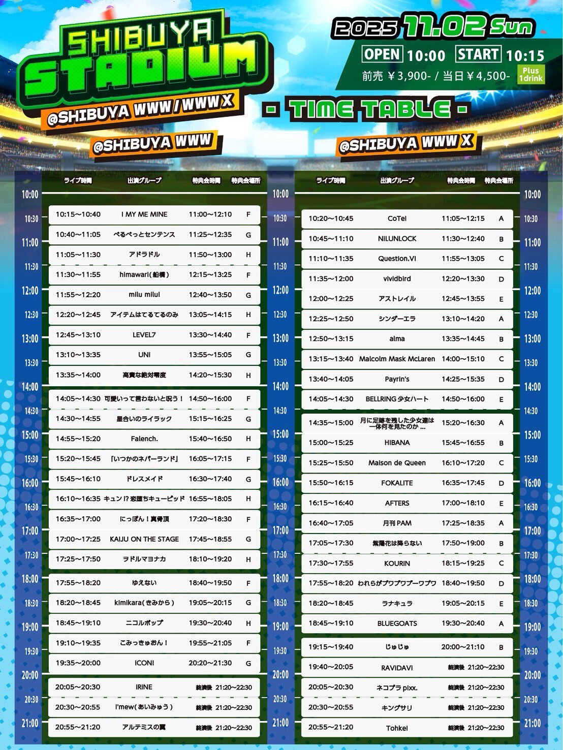 Schedule BACK TO LIST 2025.11.2[Sun] 渋谷WWW 『 SHIBUYA STADIUM 』 『 SHIBUYA STADIUM 』 11/2(日) 渋谷WWW 14:30〜14:55 15:15〜16:25 サインチェキ+サイン券4枚 開場10:00 / 開演10:15 前売3,900円 / 当日4,500円 (各+1D) t.livepocket.jp/e/ss-1102- VENUE 渋谷WWW 東京都千代田区 TIME 開場 / 0:00 開演 / 0:00 TICKET 前売 未定 / 当日 未定 ACT