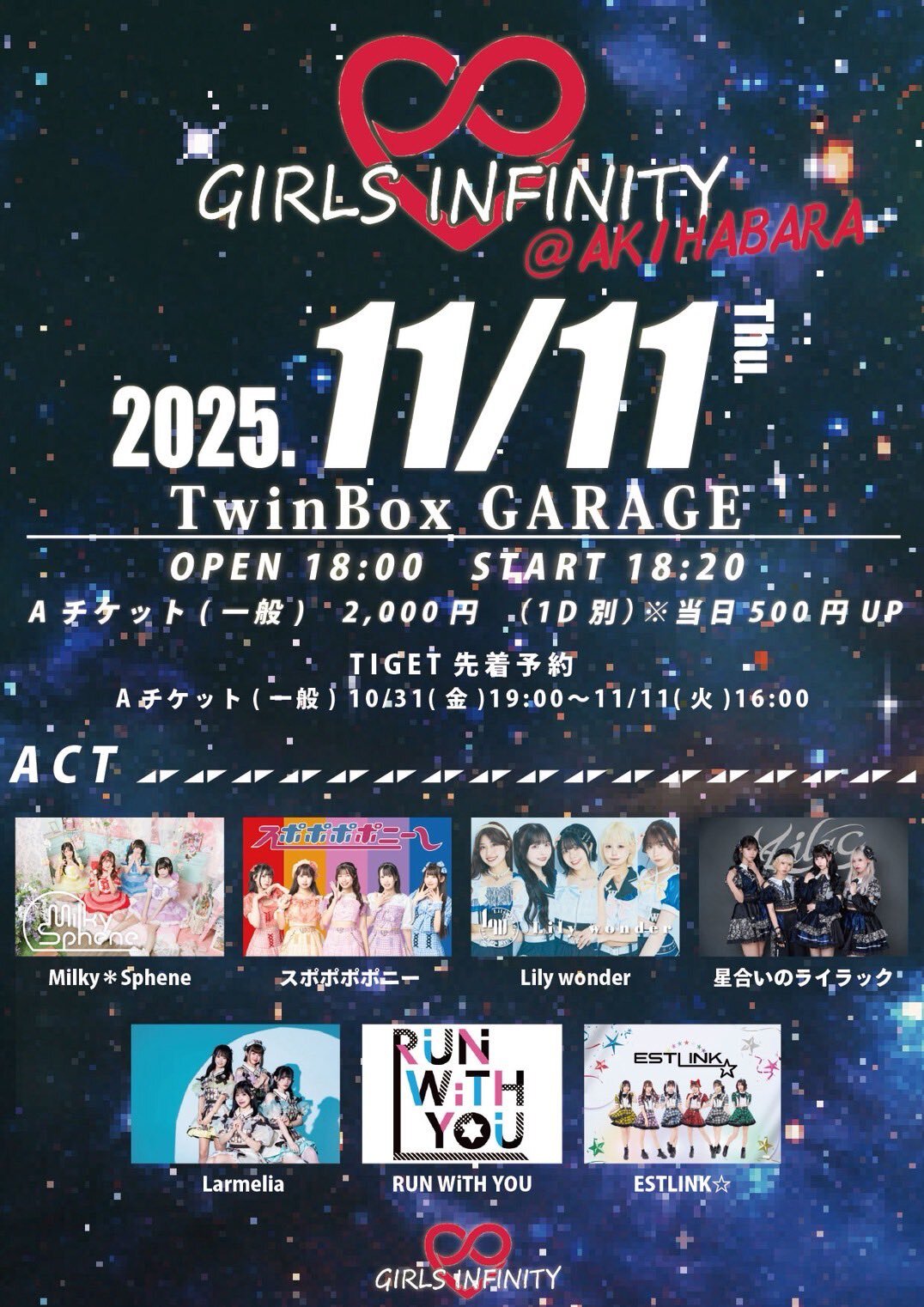 Schedule BACK TO LIST 2025.11.11[Tue] TwinBoxGARAGE 『 GIRLS INFINITY @ AKIHABARA 』 『 GIRLS INFINITY @ AKIHABARA 』 11/11(火) TwinBoxGARAGE 開場18:00 / 開演18:20 Aチケット(一般) 2,000円 (+1D) (10/31(金)19:00〜) サイン券+写メ tiget.net/events/440019 VENUE TwinBoxGARAGE 東京都 TIME 開場 / 0:00 開演 / 0:00 TICKET 前売 未定 / 当日 未定 ACT