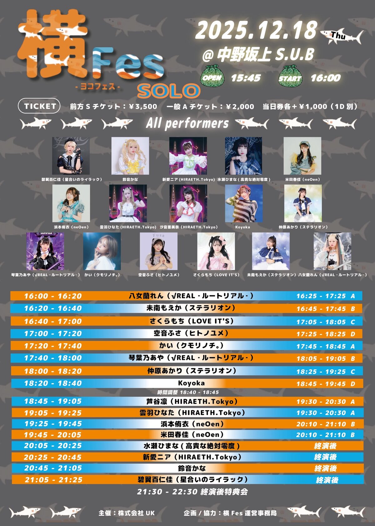 Schedule BACK TO LIST 2025.12.18[Thu] 中野坂上S.U.B 『 横Fes-ヨコフェス-SOLO- 』 『 横Fes-ヨコフェス-SOLO- 』 12/18(木) 中野坂上S.U.B 21:05〜21:25 21:30〜22:30 私物サイン+写メ+サイン券 開場15:45 / 開演16:00 前方Sチケット3,500円 / 一般Aチケット2,000円 / 当日各+1,000円 (各+1D) VENUE 中野坂上S.U.B TIME 開場 / 0:00 開演 / 0:00 TICKET 前売 未定 / 当日 未定 ACT