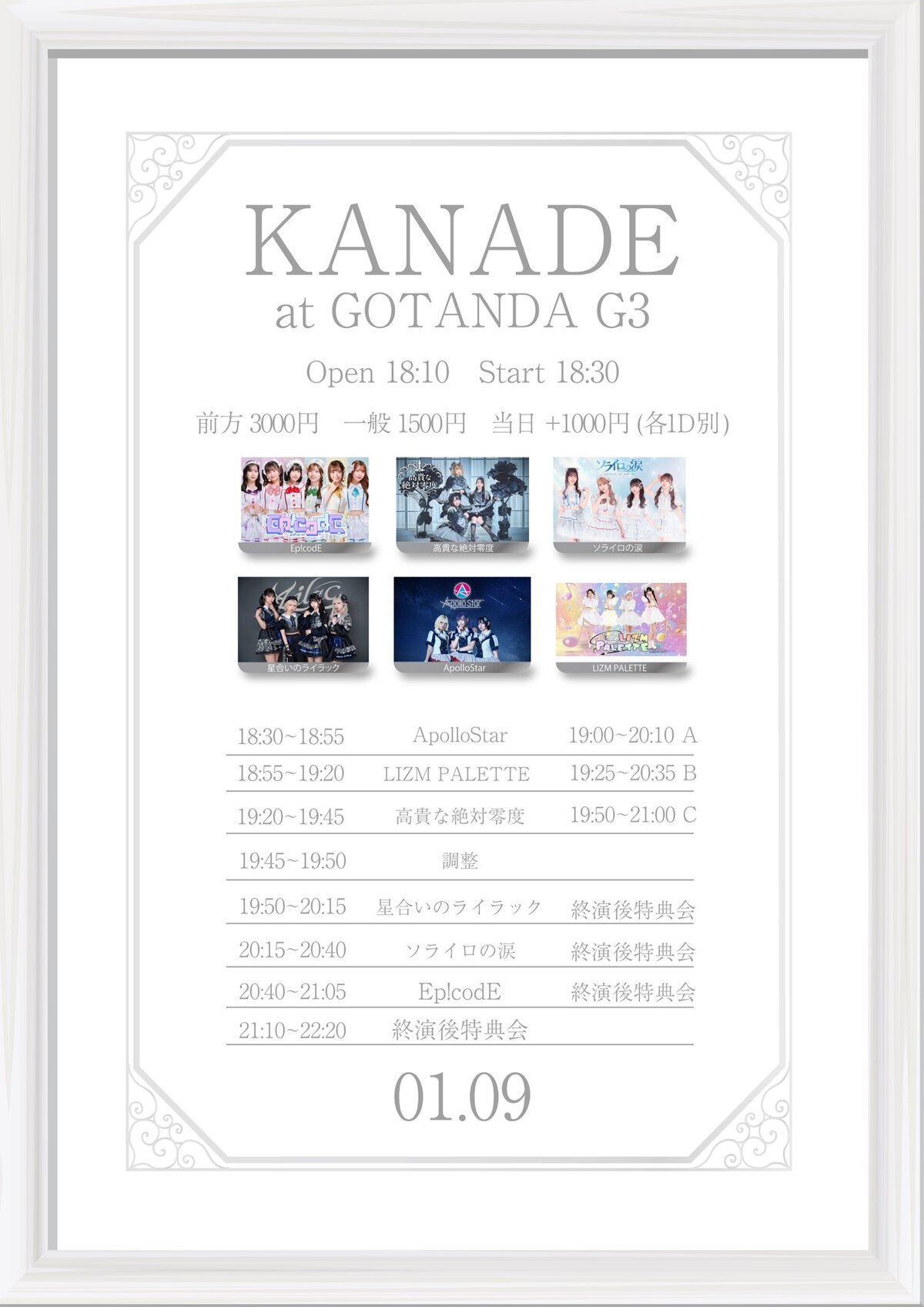 前方3,000円 / 一般1,500円 / 当日+1,000円 (各+1D)