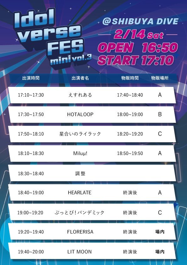 Schedule BACK TO LIST 2026.2.14[Sat] SHIBUYA DIVE 【Idolverse FES mini vol.3】 バレンタイン VENUE SHIBUYA DIVE TIME 開場 / 0:00 開演 / 0:00 TICKET 前売 未定 / 当日 未定 ACT