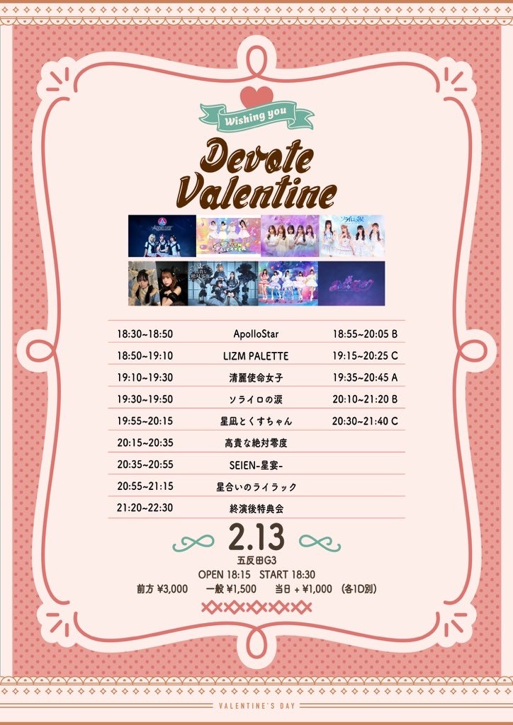 Schedule BACK TO LIST 2026.2.13[Fri] 五反田G3 Devote Valentine VENUE 五反田G3 TIME 開場 / 0:00 開演 / 0:00 TICKET 前売 未定 / 当日 未定 ACT