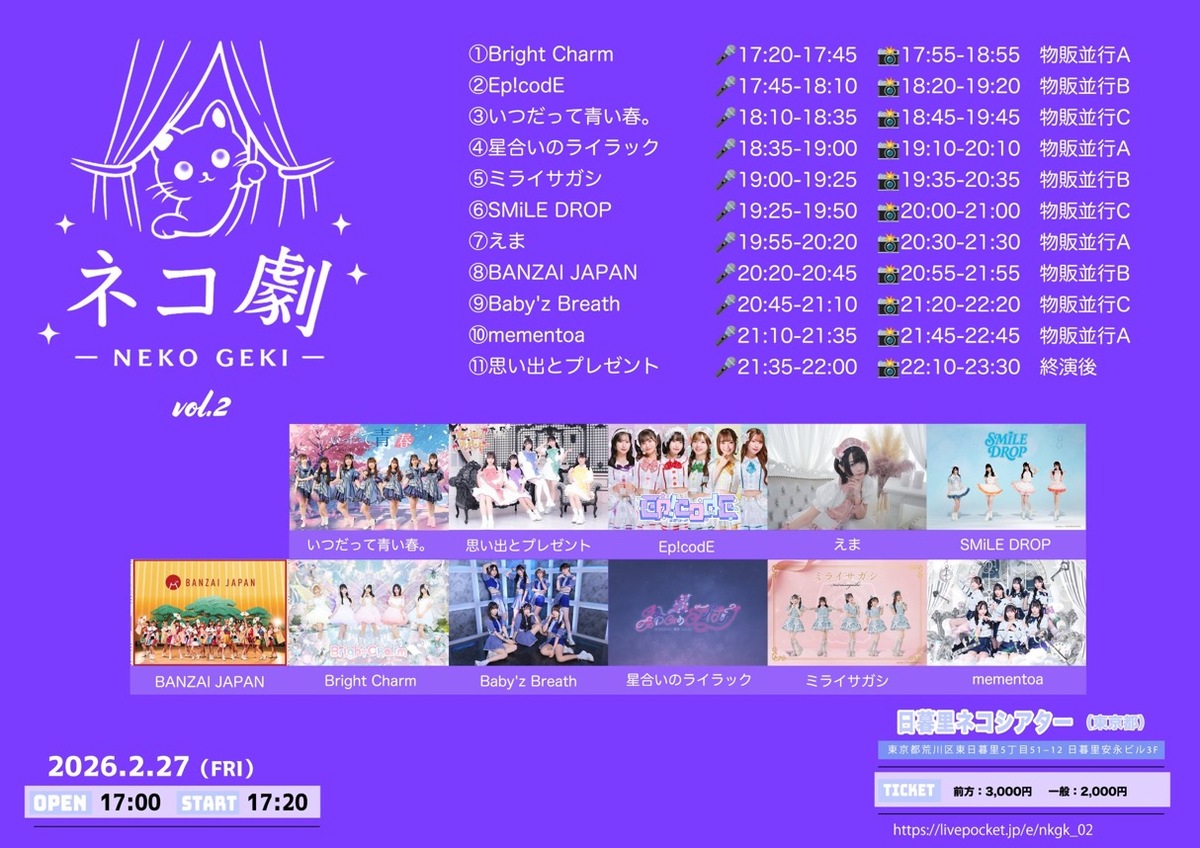 Schedule BACK TO LIST 2026.2.27[Fri] 日暮里ネコシアター ネコ劇 2/27(金) 『ネコ劇-NEKO GEKI vol.2-』 日暮里ネコシアター(駅徒歩1分 ) OP17:00/ ST17:20 前方エリア 3,000円 / 一般 2,000円(各1D別) ※当日券各+500円 VENUE 日暮里ネコシアター TIME 開場 / 0:00 開演 / 0:00 TICKET 前売 未定 / 当日 未定 ACT