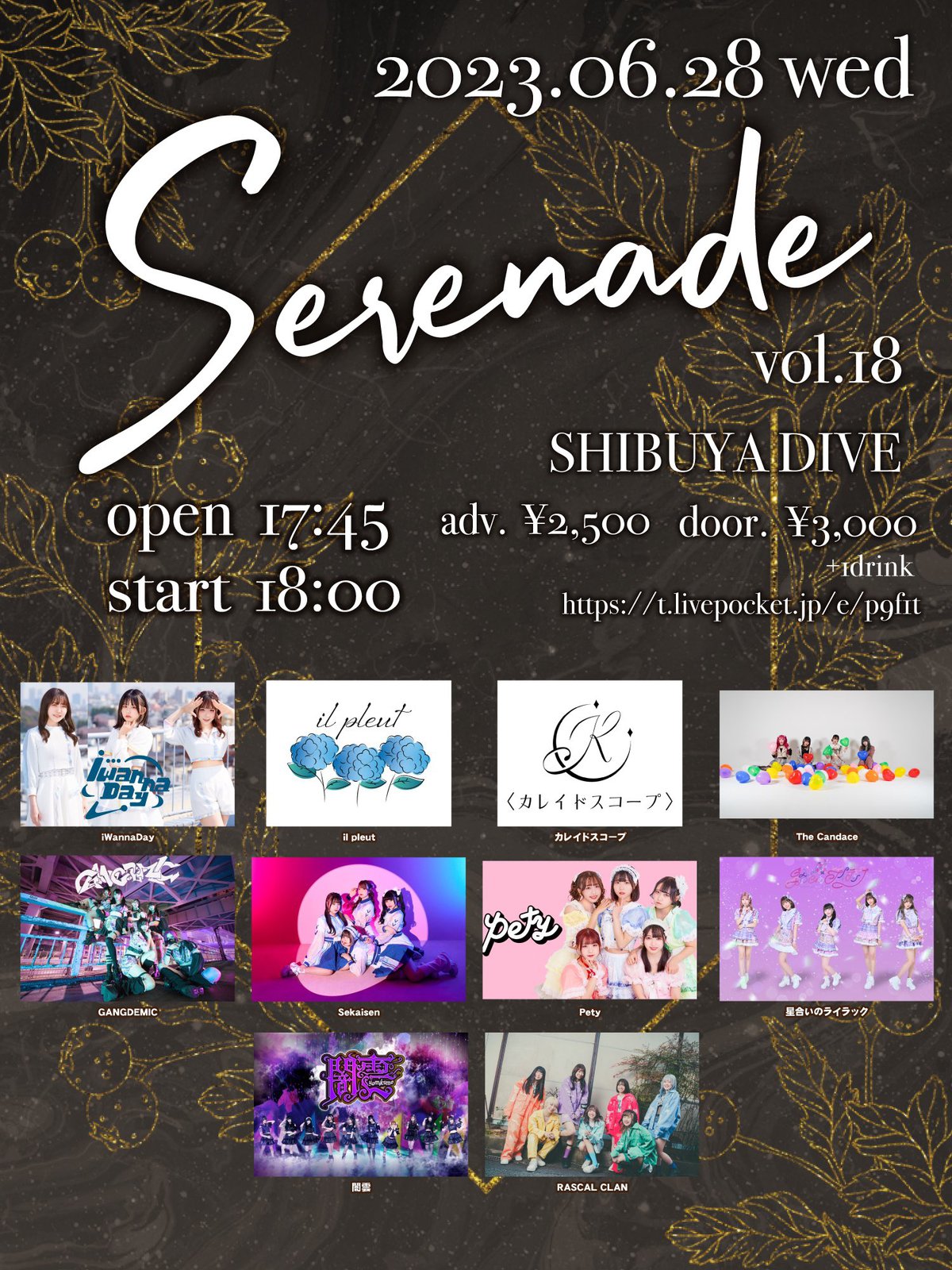 Schedule BACK TO LIST 2023.6.28[Wed] SHIBUYA DIVE Serenade Serenade @SHIBUYA DIVE 開場17:45 開演18:00 前売り2500円 当日3000円(各1D別) チケットはこちら https://t.co/ctjhKyVVTO VENUE SHIBUYA DIVE 東京都千代田区 TIME 開場 / 17:45 開演 / 18:00 TICKET 前売 ¥ 2,500 / 当日 ¥ 3,000 ACT