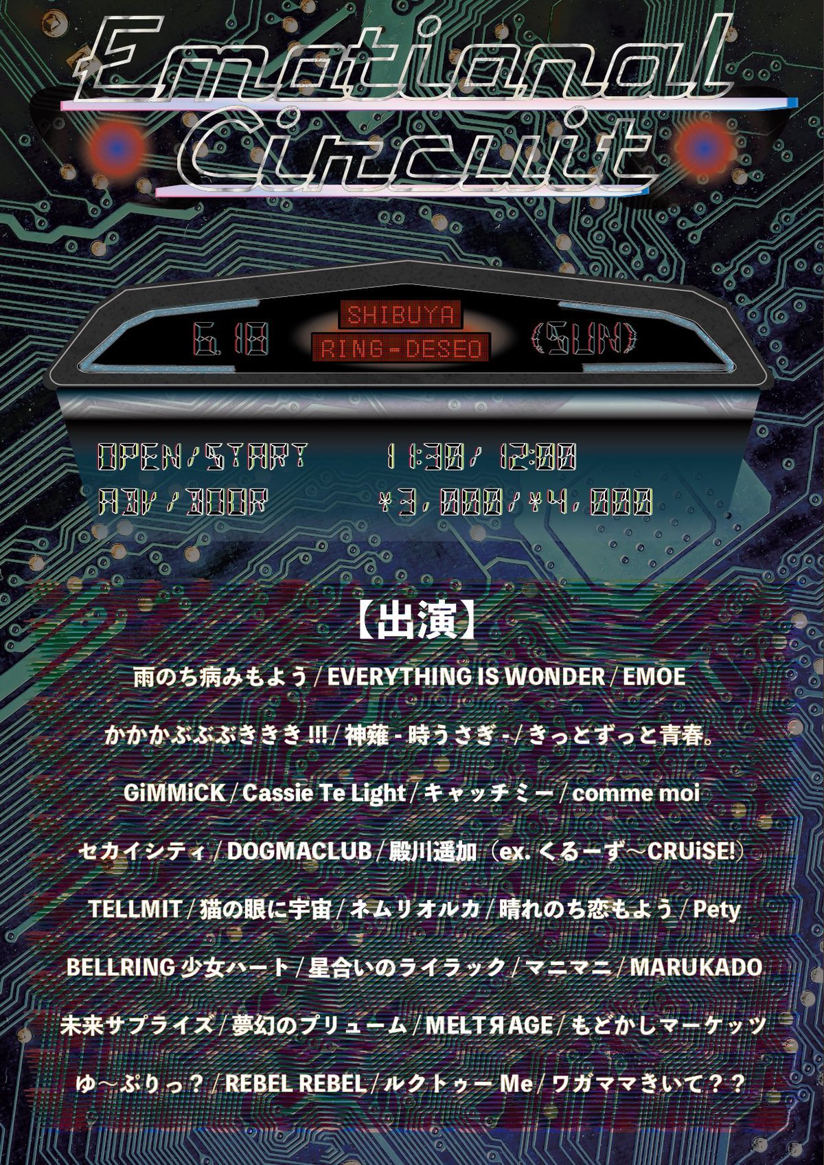 Schedule BACK TO LIST 2023.6.18[Sun] 渋谷DESEO & 渋谷RING 2会場サーキット Emotional Circuit チケットはこちら https://t.co/WIFt5OswbX VENUE 渋谷DESEO & 渋谷RING 2会場サーキット 東京都渋谷区 TIME 開場 / 11:30 開演 / 12:00 TICKET 前売 ¥ 3,000 / 当日 ¥ 4,000 ACT