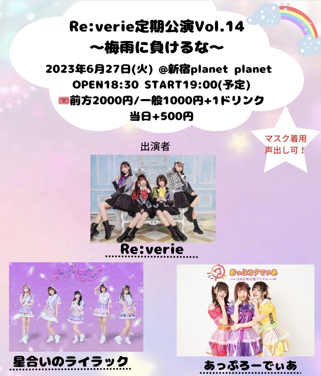 Schedule BACK TO LIST 2023.6.27[Tue] 新宿planet planet 「Re:verie定期公演vol.14〜梅雨に負けるな〜」 VENUE 新宿planet planet 東京都新宿区 TIME 開場 / 未定 開演 / 未定 TICKET 前売 未定 / 当日 未定 ACT