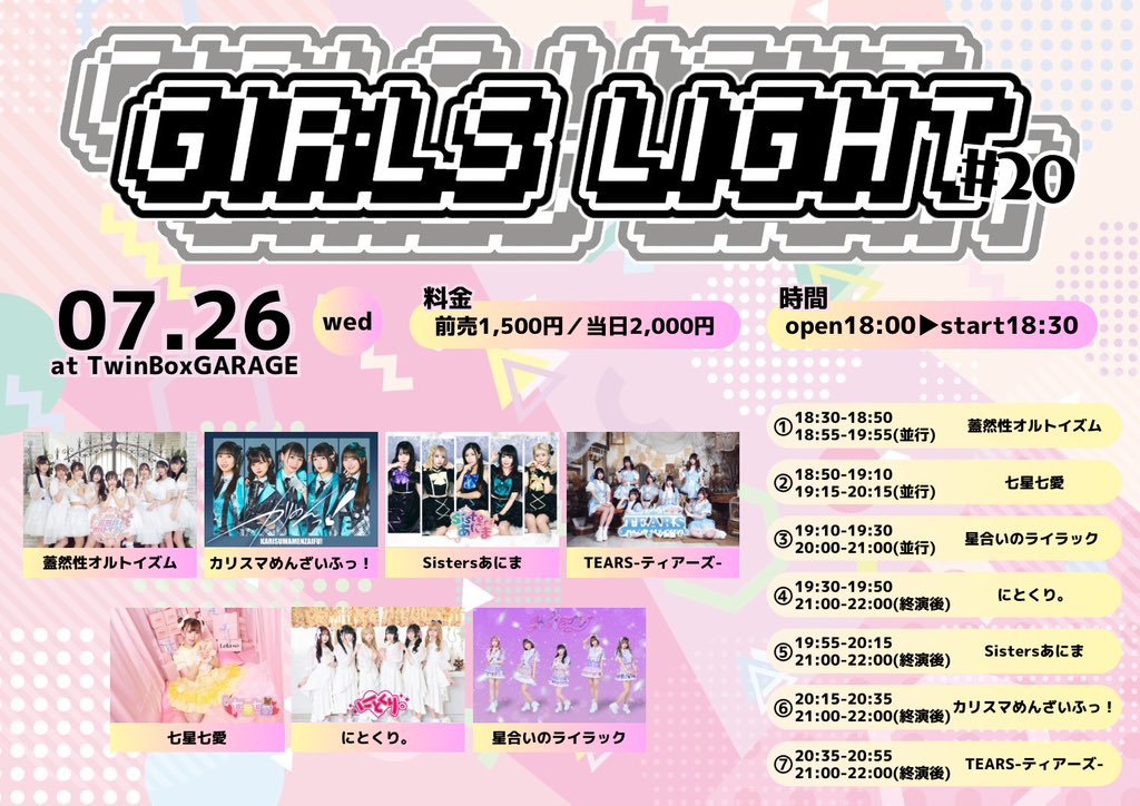 Schedule BACK TO LIST 2023.7.26[Wed] 都内 GIRLS★LIGHT#20@TwinBoxGARAGE 7/26(水) GIRLS★LIGHT#20@TwinBoxGARAGE チケットはこちら https://t.co/zImqelYjIX 入場特典 サイン無しチェキ VENUE 都内 東京都千代田区 TIME 開場 / 0:00 開演 / 0:00 TICKET 前売 未定 / 当日 未定 ACT