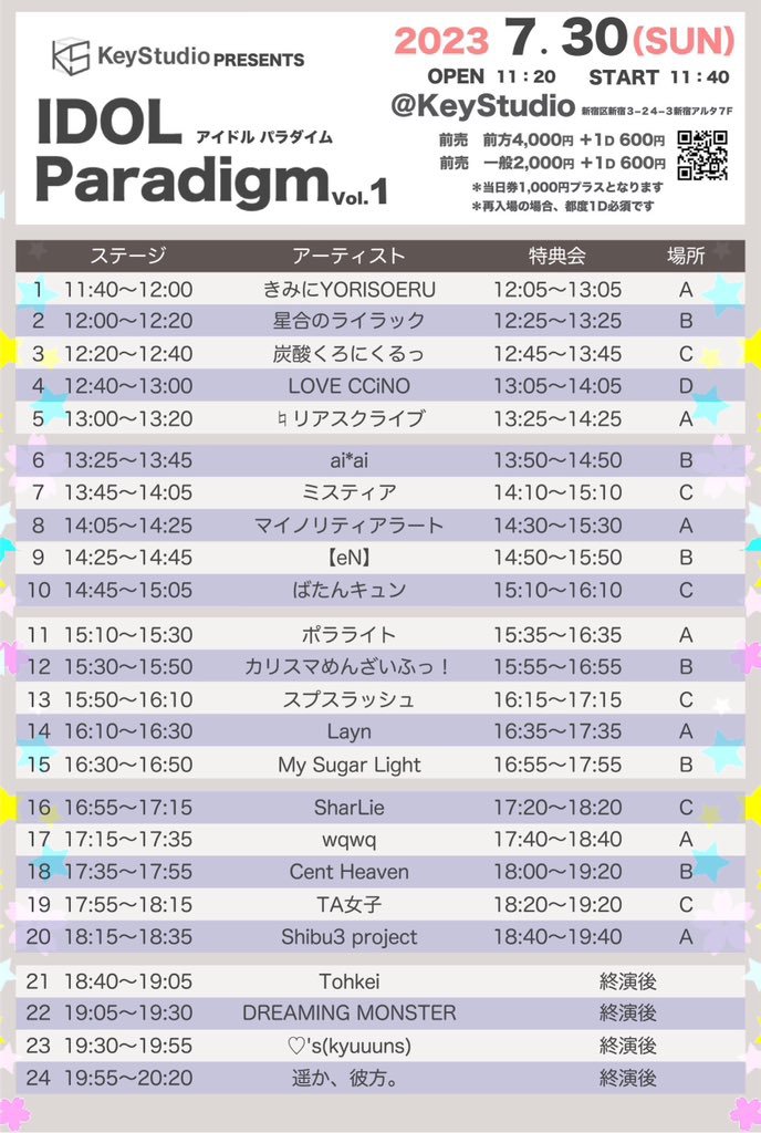 Schedule BACK TO LIST 2023.7.30[Sun] ALTA Key Studio IDOL Paradigm @ALTA Key Studio 7/30(日) IDOL Paradigm @ALTA Key Studio チケットはこちら https://t.co/EyR3Mzs5zF 入場特典 サインチェキ VENUE ALTA Key Studio 東京都千代田区 TIME 開場 / 0:00 開演 / 0:00 TICKET 前売 未定 / 当日 未定 ACT