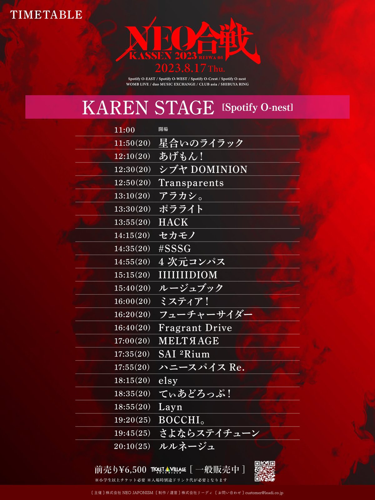 Schedule BACK TO LIST 2023.8.17[Thu] Spotify O-nest ①NEO KASSEN 2023 タイムテーブル解禁 VENUE Spotify O-nest 東京都渋谷区 TIME 開場 / 0:00 開演 / 0:00 TICKET 前売 未定 / 当日 未定 ACT