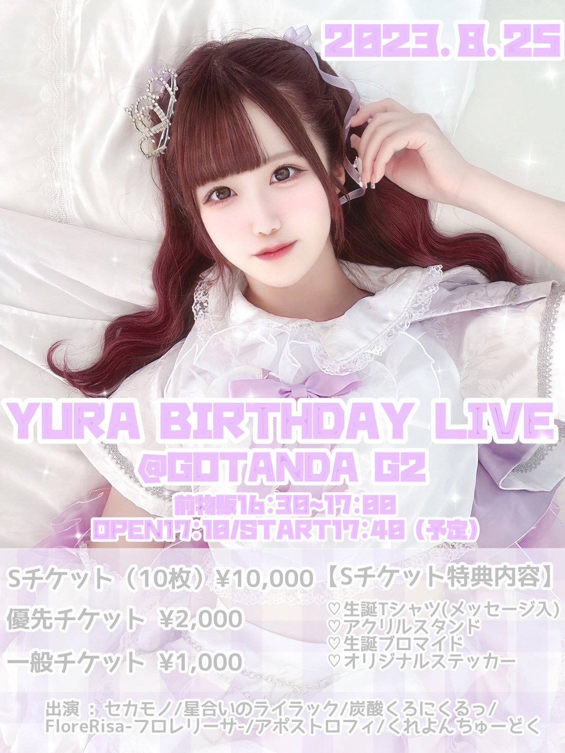 Schedule BACK TO LIST 2023.8.25[Fri] GOTANDA G2 『YURA BIRTHDAY LIVE』 VENUE GOTANDA G2 東京都千代田区 TIME 開場 / 0:00 開演 / 0:00 TICKET 前売 未定 / 当日 未定 ACT