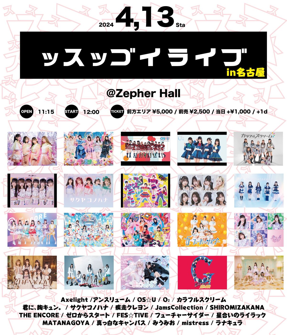 Schedule BACK TO LIST 2024.4.13[Sat] Zepher Hall 【ッスッゴイ名古屋ライブ】 4/13(土) 【ッスッゴイ名古屋ライブ】 Zepher Hall 開場11:15 / 開演12:00 前方¥5,000 / 一般¥2,500(各D代別) 先行 3/22 21:00〜3/29 23:59 一般 3/30 21:00〜 #星合いのライブ VENUE Zepher Hall 愛知県名古屋市中区 TIME 開場 / 0:00 開演 / 0:00 TICKET 前売 未定 / 当日 未定 ACT