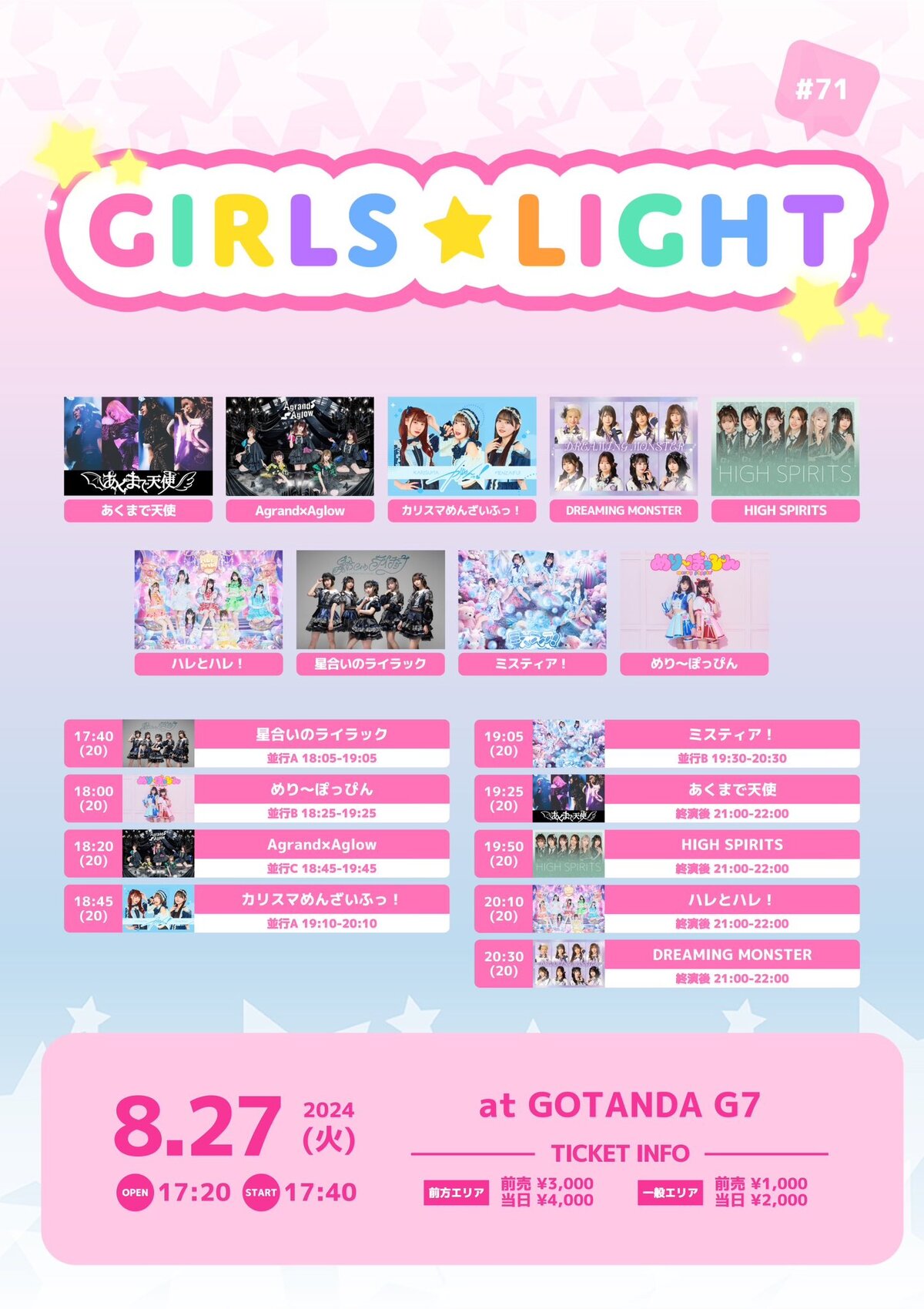 Schedule BACK TO LIST 2024.8.27[Tue] GOTANDA G7 『GIRLS★LIGHT#71』 8/27(火) 『GIRLS★LIGHT#71』 GOTANDA G7 開場17:20/開演17:40 前売前方エリア3,000円/前売一般エリア1,000円/当日各+1,000円(各D代別) t.livepocket.jp/e/girlslight71 販売期間:8月5日(月)22:00-8月27日(火)15:00まで VENUE GOTANDA G7 東京都千代田区 TIME 開場 / 0:00 開演 / 0:00 TICKET 前売 未定 / 当日 未定 ACT
