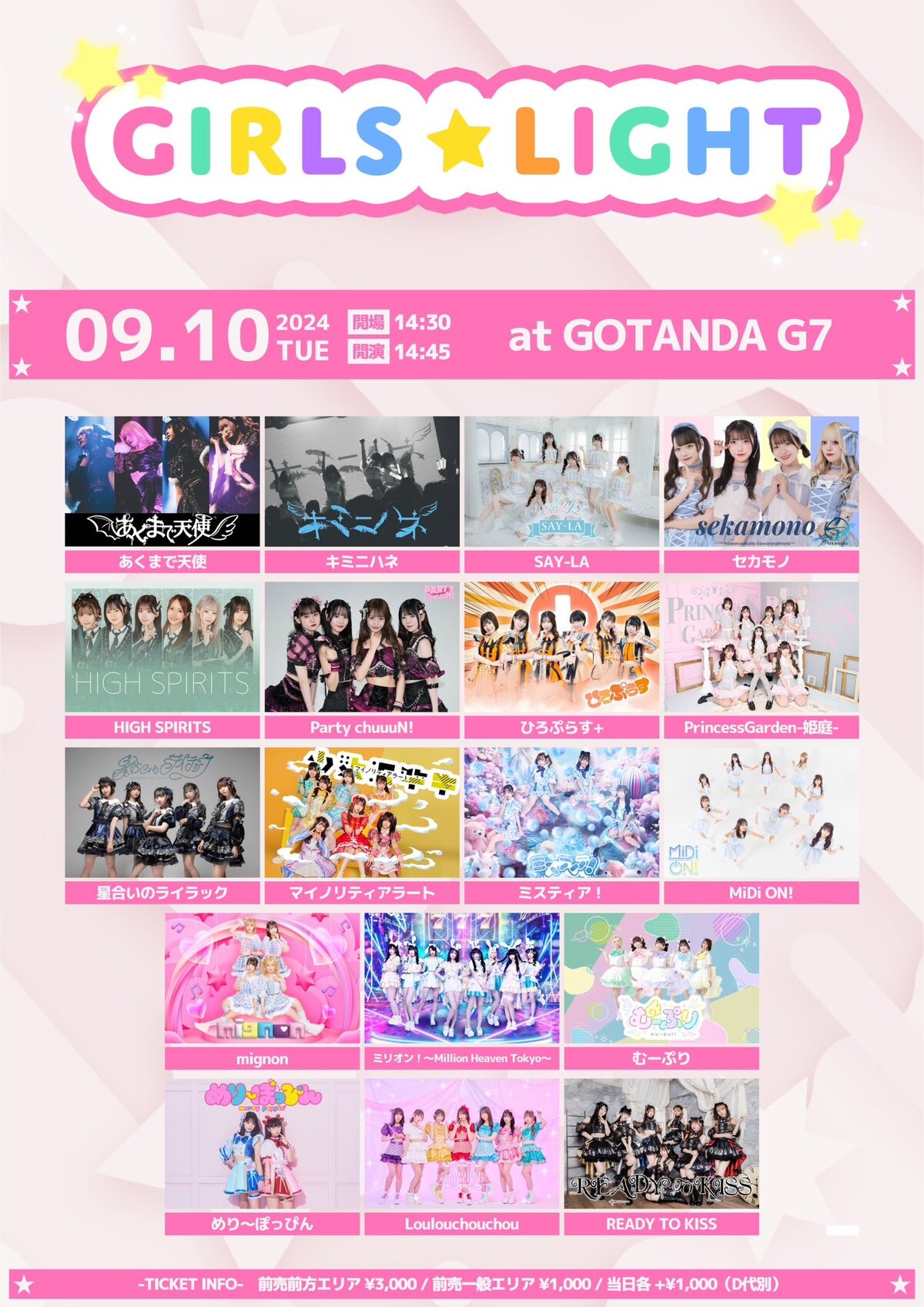 前売前方エリア3,000円/前売一般エリア1,000円/当日各+1,000円(各D代別)