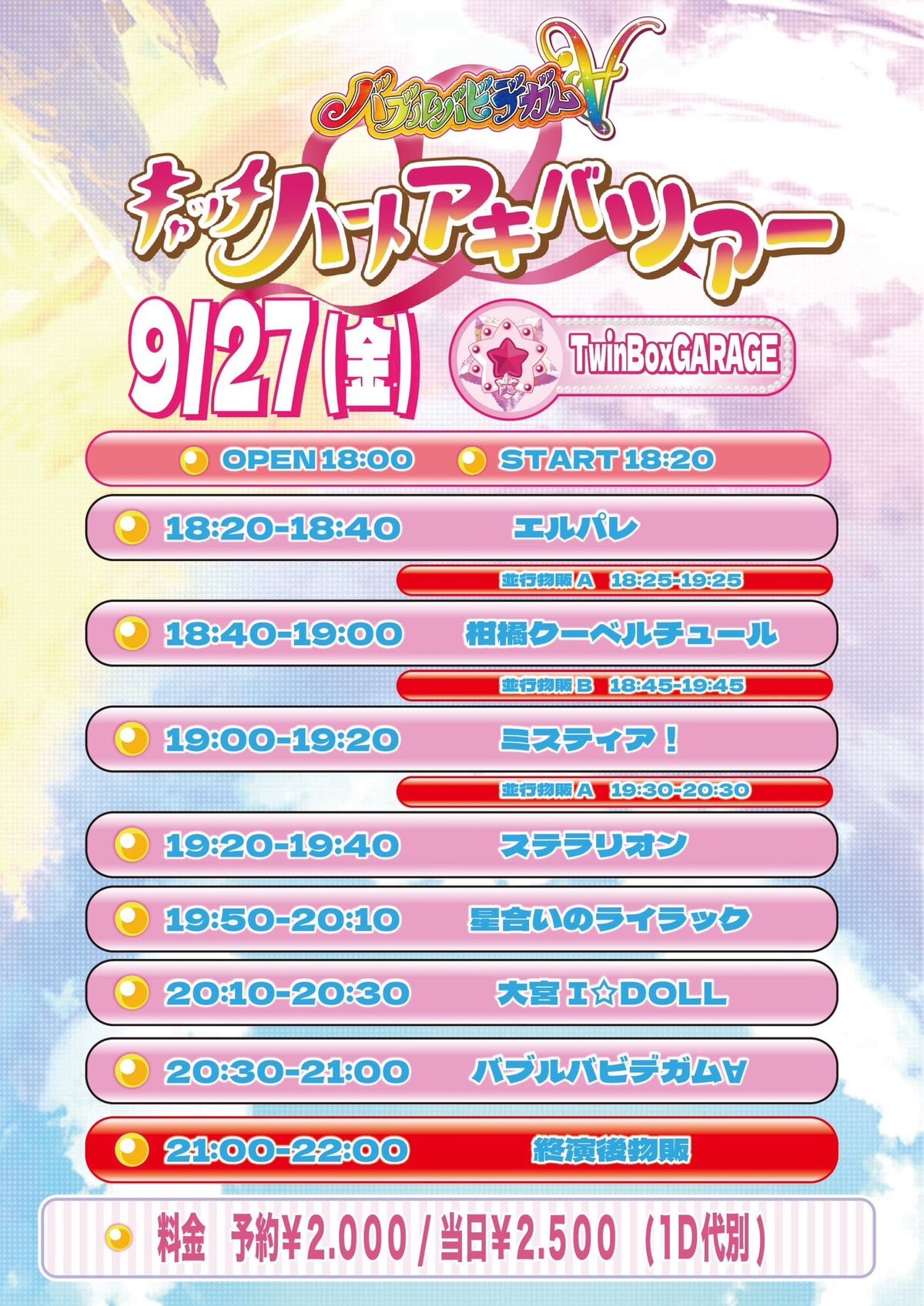 Schedule BACK TO LIST 2024.9.27[Fri] TwinBoxGARAGE キャッチハートアキバツアー 『キャッチハートアキバツアー』 TwinBoxGARAGE OPEN 18:00 START 18:20 予約 ¥2000 当日 ¥2500 (各+1D) tiget.net/events/346726 サイン券2枚 VENUE TwinBoxGARAGE 東京都千代田区 TIME 開場 / 0:00 開演 / 0:00 TICKET 前売 未定 / 当日 未定 ACT