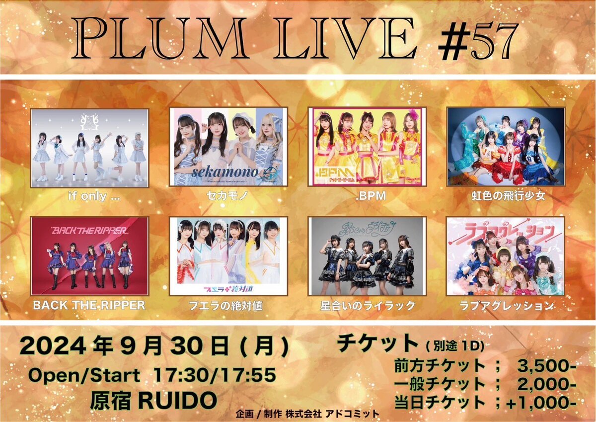 Schedule BACK TO LIST 2024.9.30[Mon] 原宿RUIDO PLUM LIVE #57 原宿RUIDO Open/Start 17:30/17:55 【チケット】(別途1D) 前方チケット ¥3,500- 一般チケット ¥2,000- t.livepocket.jp/e/cqvlu 星合いチケット1ポイント、写メ VENUE 原宿RUIDO 東京都千代田区 TIME 開場 / 0:00 開演 / 0:00 TICKET 前売 未定 / 当日 未定 ACT