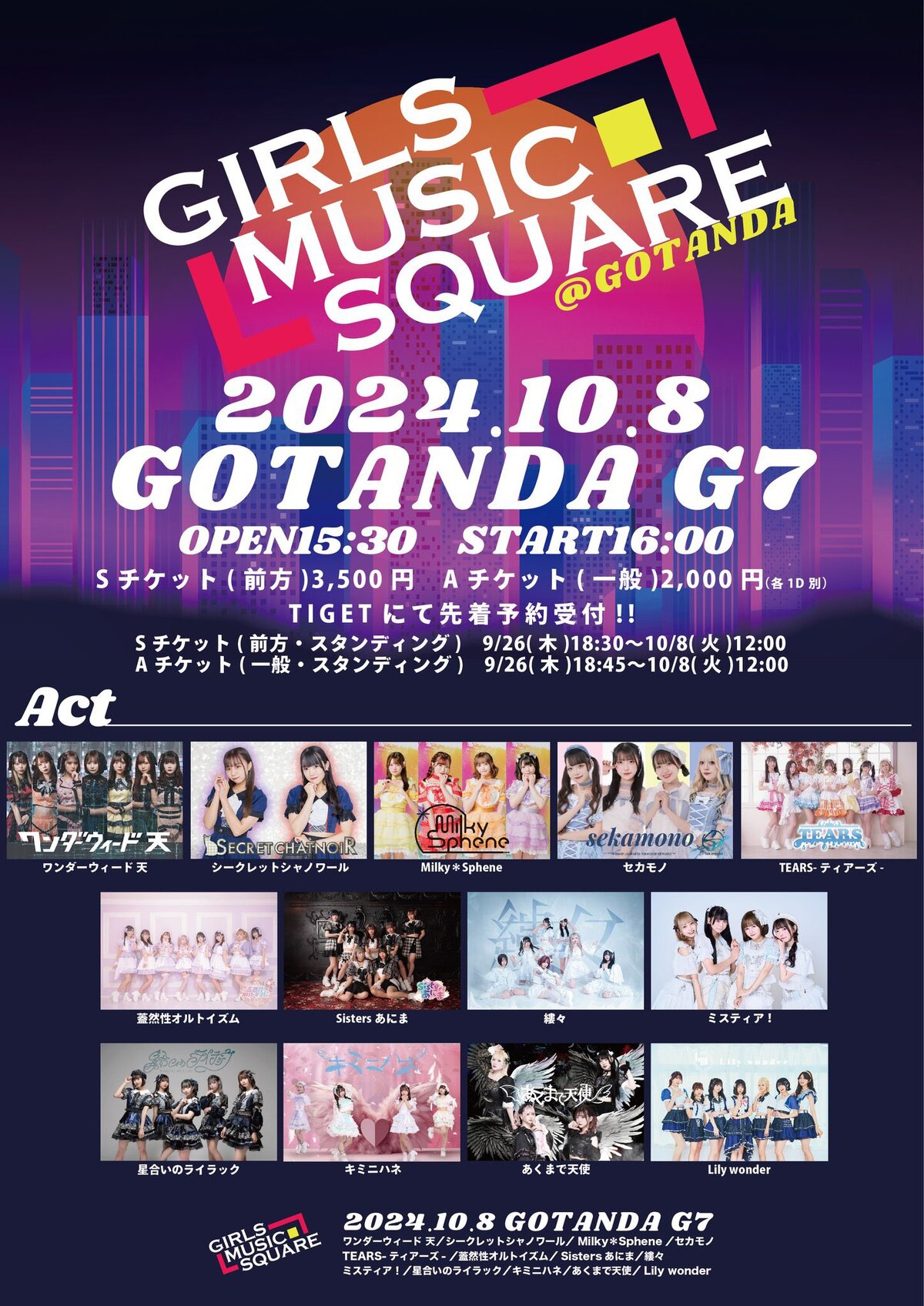 Schedule BACK TO LIST 2024.10.8[Tue] 五反田G7 GIRLS MUSIC SQUARE GIRLS MUSIC SQUARE GOTANDA G7 (東京都品川区西五反田2-6-3 東洋ビル B1) 開場15:30 開演16:00 Sチケット(前方)3,500円 Aチケット(一般)2,000円(各1D別) tiget.net/events/349079 S 9/26(木)18:30〜 A 9/26(木)18:45〜 VENUE 五反田G7 東京都千代田区 TIME 開場 / 0:00 開演 / 0:00 TICKET 前売 未定 / 当日 未定 ACT