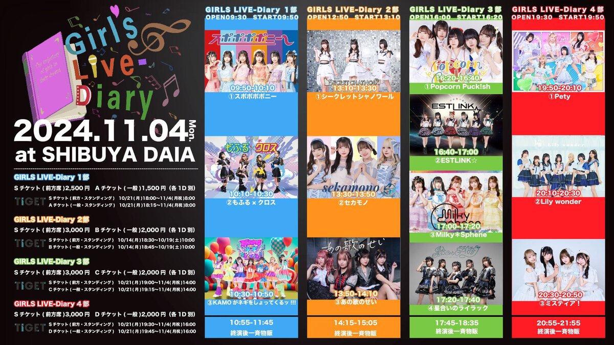 Schedule BACK TO LIST 2024.11.4[Mon] SHIBUYA DAIA GIRLS LIVE-Diary 11/4 GIRLS LIVE-Diary SHIBUYA DAIA 3部 Op16:00/St16:20 https://tiget.net/events/354296 サイン券、写メ VENUE SHIBUYA DAIA 東京都千代田区 TIME 開場 / 0:00 開演 / 0:00 TICKET 前売 未定 / 当日 未定 ACT