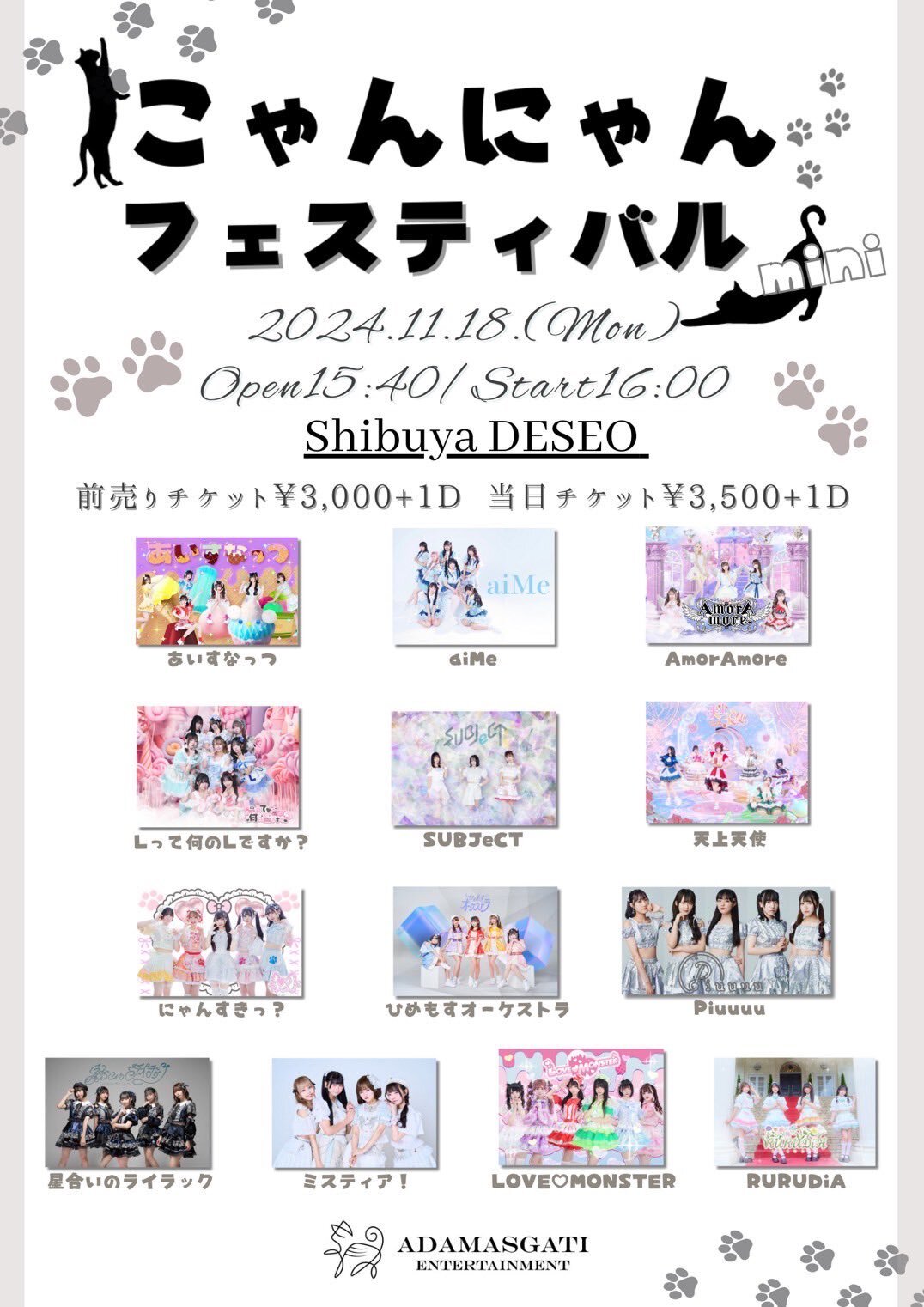 Schedule BACK TO LIST 2024.11.18[Mon] SHIBUYA DESEO にゃんにゃんフェスティバルmini 11/18 にゃんにゃんフェスティバルmini SHIBUYA DESEO 開場15:40/開演16:00 前売り ¥3,000 / 当日 ¥3,500 VENUE SHIBUYA DESEO 東京都千代田区 TIME 開場 / 0:00 開演 / 0:00 TICKET 前売 未定 / 当日 未定 ACT