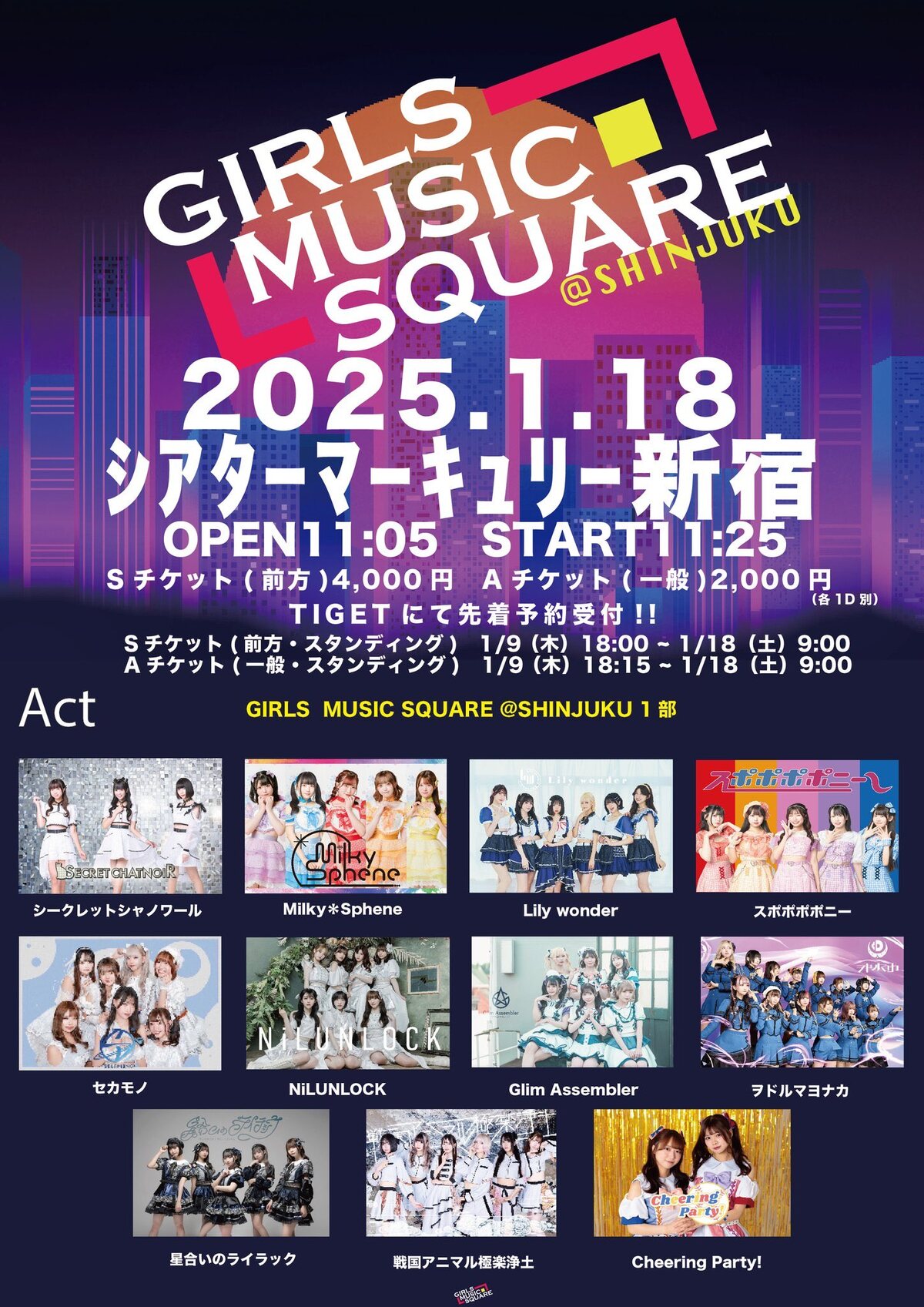 Schedule BACK TO LIST 2025.1.18[Sat] シアターマーキュリー新宿 『GIRLS MUSIC SQUARE @新宿 」 1/18 (土) 『GIRLS MUSIC SQUARE @新宿 」 シアターマーキュリー新宿 1部 OPEN11:05 / START11:25 tiget.net/events/371193 VENUE シアターマーキュリー新宿 東京都 TIME 開場 / 0:00 開演 / 0:00 TICKET 前売 未定 / 当日 未定 ACT