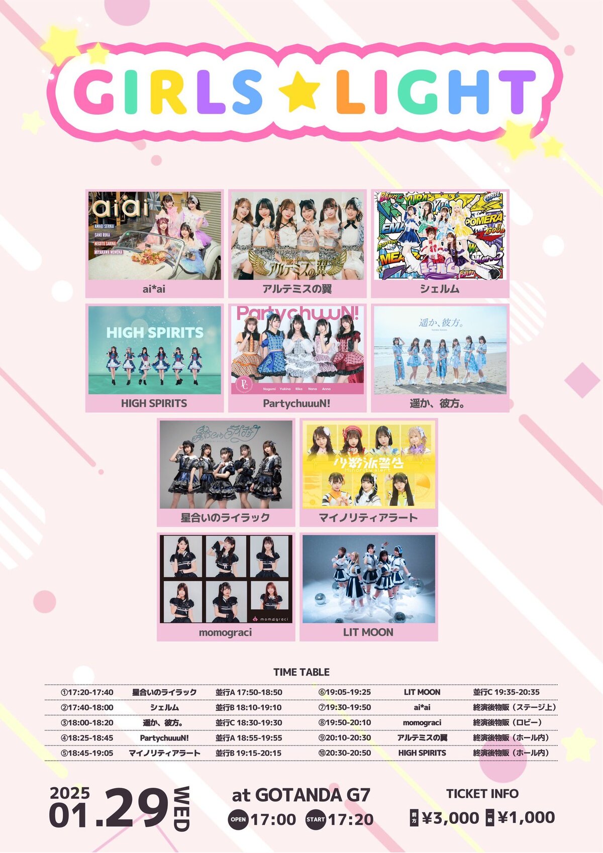 Schedule BACK TO LIST 2025.1.29[Wed] GOTANDA G7 『GIRLS★LIGHT#77』 1/29 『GIRLS★LIGHT#77』 GOTANDA G7 開場17:00/開演17:20 前売前方エリア3,000円/前売一般エリア1,000円/当日各+1,000円(各D代別) t.livepocket.jp/e/girlslight77 1月11日(土)22:00-1月29日(水)15:00まで VENUE GOTANDA G7 東京都千代田区 TIME 開場 / 0:00 開演 / 0:00 TICKET 前売 未定 / 当日 未定 ACT