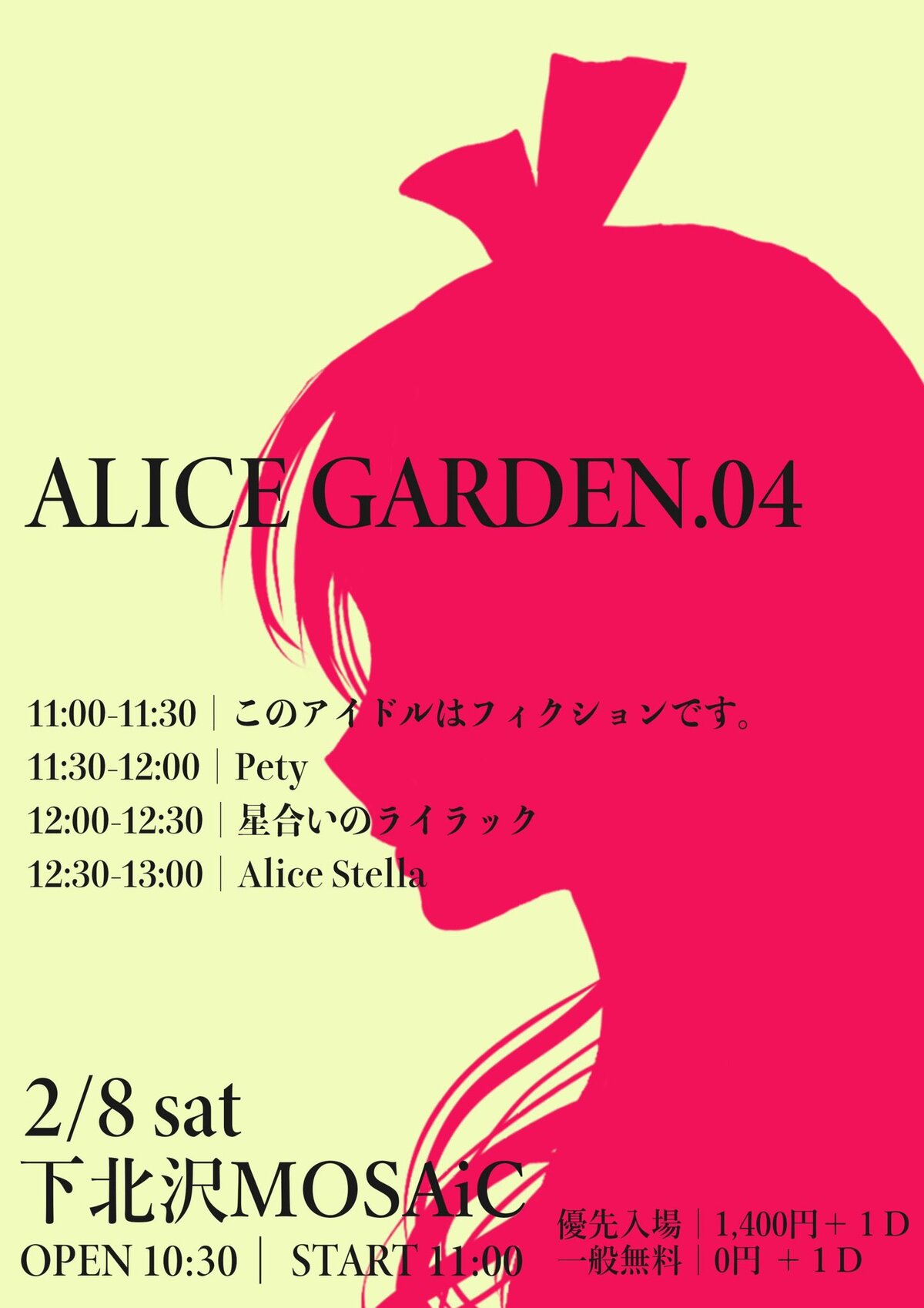 Schedule BACK TO LIST 2025.2.8[Sat] ALICEGARDEN04 Alice Sttella主催 2/8 Alice Sttella主催 ALICEGARDEN04 下北沢mosaic 優先入場|1400円+1D 一般無料|0円+D代 OPEN 10:30/START 11:00 t.livepocket.jp/e/bv5ty 写メ VENUE ALICEGARDEN04 東京都千代田区 TIME 開場 / 0:00 開演 / 0:00 TICKET 前売 未定 / 当日 未定 ACT