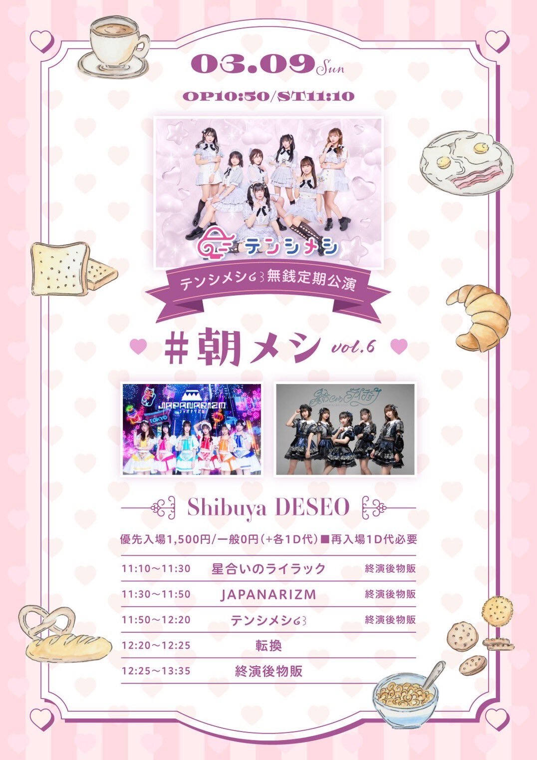 Schedule BACK TO LIST 2025.3.9[Sun] 渋谷DESEO テンシメシ໒꒱無銭定期公演 『#朝メシ vol.6』 3/9 (日) テンシメシ໒꒱無銭定期公演 『#朝メシ vol.6』 渋谷DESEO OPEN10:50/START11:10 優先入場1,500円/一般0円(+各1D代) 再入場1D代必要 t-dv.com/asameshi6 2/24 20:00- 写メ VENUE 渋谷DESEO 東京都千代田区 TIME 開場 / 0:00 開演 / 0:00 TICKET 前売 未定 / 当日 未定 ACT