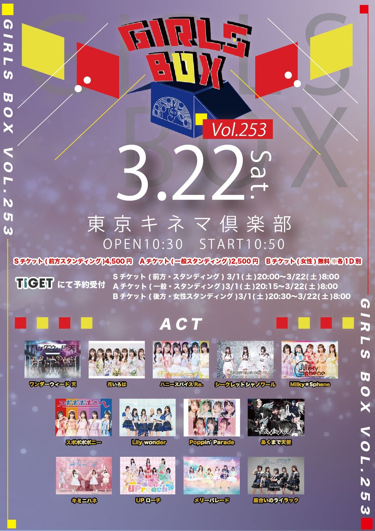 Schedule BACK TO LIST 2025.3.22[Sat] 東京キネマ倶楽部 『 GIRLS BOX VOL.253 』 3/22 (土) 『 GIRLS BOX VOL.253 』 東京キネマ倶楽部 開場10:30 開演10:50 Sチケット(前方スタンディング)4,500円 Aチケット(一般スタンディング)2,500円 Bチケット(女性)観覧無料 ※各1D別 tiget.net/events/383270 3/1(土)20:00〜 順次 VENUE 東京キネマ倶楽部 東京都千代田区 TIME 開場 / 0:00 開演 / 0:00 TICKET 前売 未定 / 当日 未定 ACT