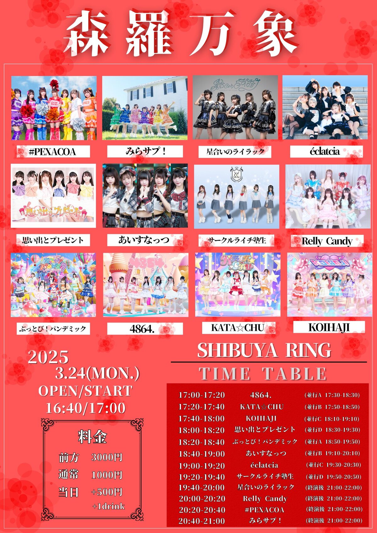 Schedule BACK TO LIST 2025.3.24[Mon] SHIBUYA RING 森羅万象 森羅万象 SHIBUYA RING OPEN/START:16:40/17:00 前方3000円/通常1000円/当日+500円(各D別) t-dv.com/0324ring VENUE SHIBUYA RING 東京都千代田区 TIME 開場 / 0:00 開演 / 0:00 TICKET 前売 未定 / 当日 未定 ACT