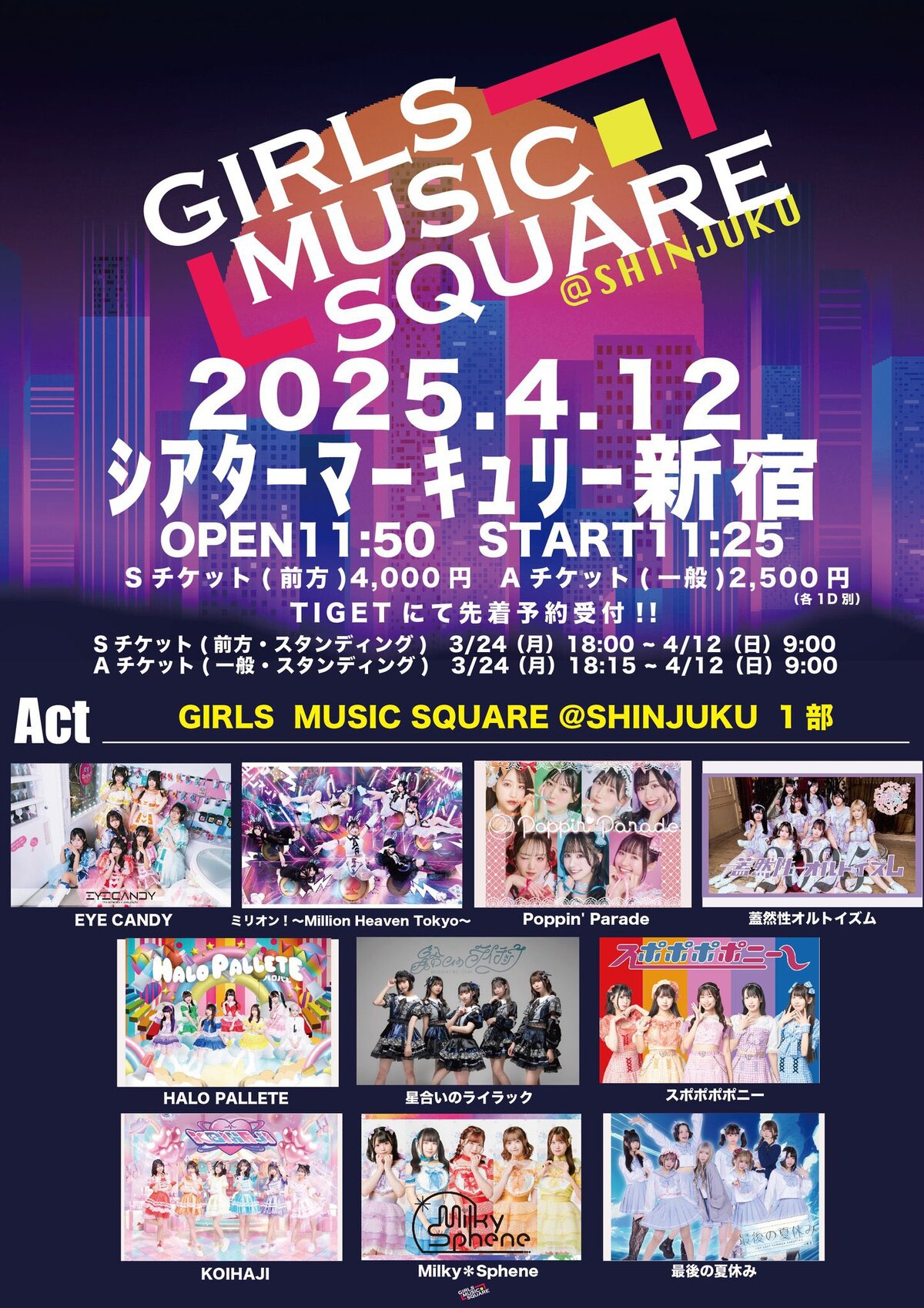 Schedule BACK TO LIST 2025.4.12[Sat] シアターマーキュリー新宿 『GIRLS MUSIC SQUARE @新宿 1,2部』 4/12(土) 『GIRLS MUSIC SQUARE @新宿 1,2部』 シアターマーキュリー新宿 1部 tiget.net/events/389002 3/24 18:00〜 VENUE シアターマーキュリー新宿 東京都千代田区 TIME 開場 / 0:00 開演 / 0:00 TICKET 前売 未定 / 当日 未定 ACT