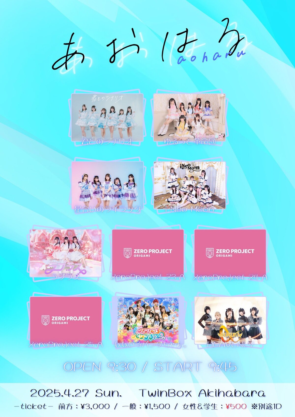 Schedule BACK TO LIST 2025.4.27[Sun] TwinBoxAKIHABARA あおはる 4/27(日) TwinBoxAKIHABARA 開場9:30 / 開演9:45 前方3,000円 / 通常1,500円 / 女性&学生500円 (各+1D) t-dv.com/aoharu0427 VENUE TwinBoxAKIHABARA 東京都千代田区 TIME 開場 / 0:00 開演 / 0:00 TICKET 前売 未定 / 当日 未定 ACT
