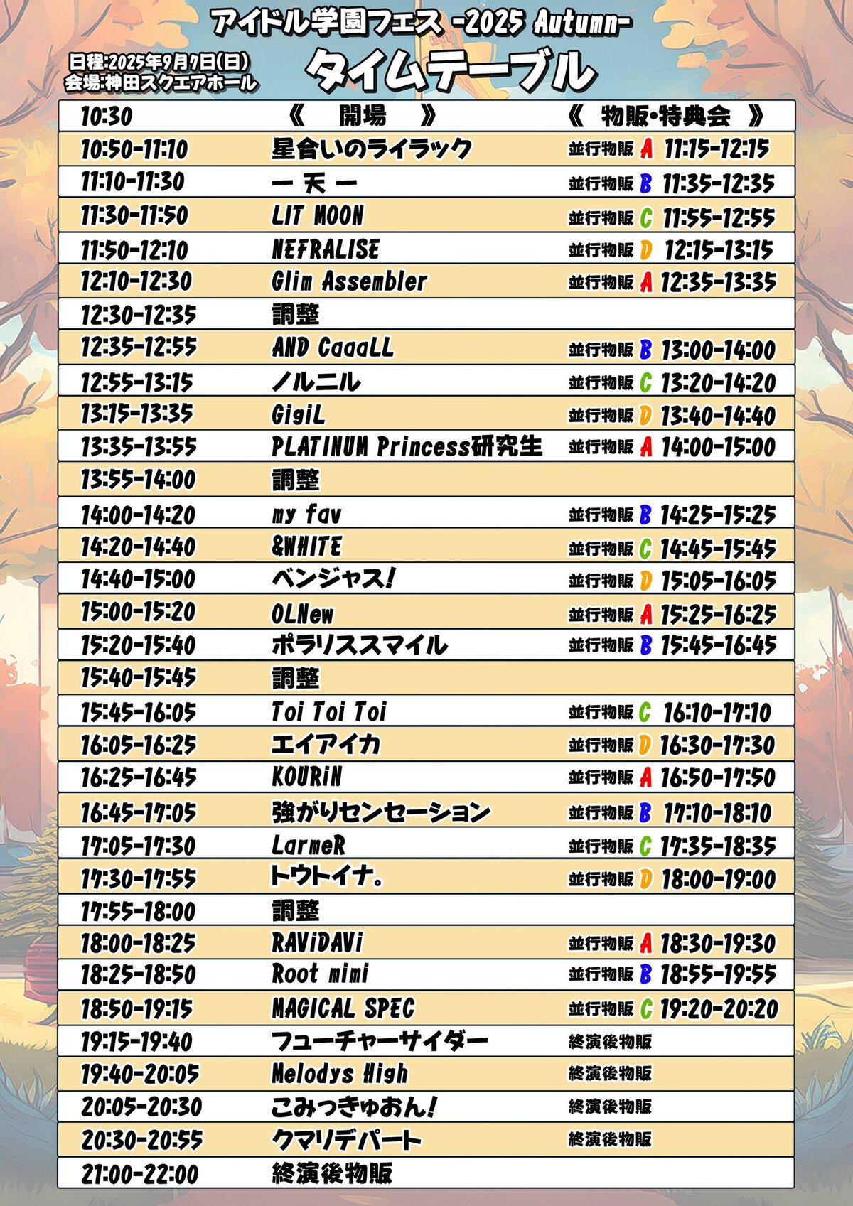 Schedule BACK TO LIST 2025.9.7[Sun] 神田スクエアホール 【アイドル学園フェス -2025 Autumn-】 ★ 9/7(日) 【アイドル学園フェス -2025 Autumn-】 神田スクエアホール OPEN 10:30 / START 10:50 t-dv.com/2025_09_07_idol VENUE 神田スクエアホール 東京都千代田区 TIME 開場 / 0:00 開演 / 0:00 TICKET 前売 未定 / 当日 未定 ACT