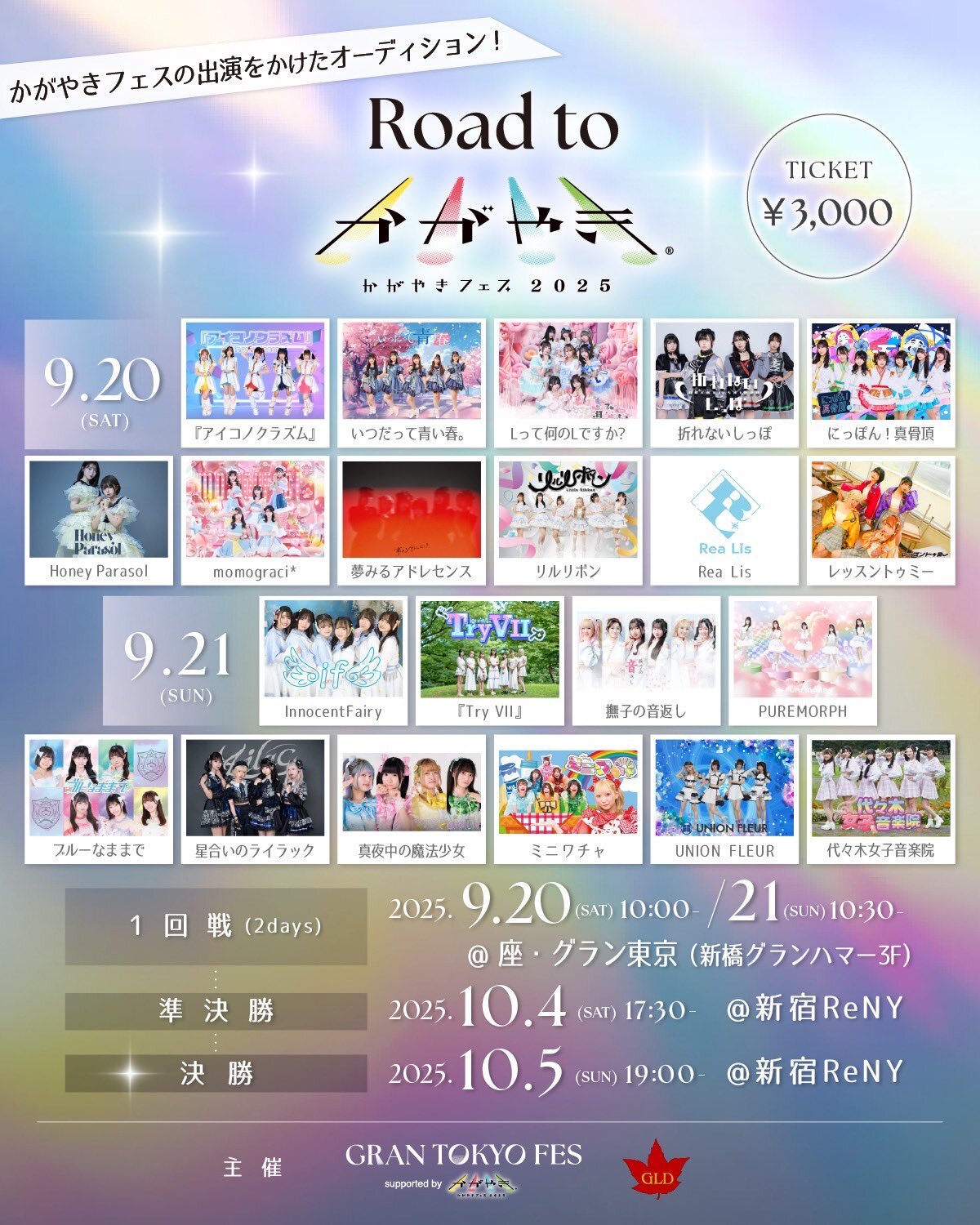 Schedule BACK TO LIST 2025.9.21[Sun] グランハマー3階「座・グラン東京」 Road to かがやきフェス ★ 9/21(日) グランハマー3階「座・グラン東京」 10:00開場/10:30開演 3,000円/当日+1,000円(各+1D) tiget.net/events/426329 VENUE グランハマー3階「座・グラン東京」 東京都千代田区 TIME 開場 / 0:00 開演 / 0:00 TICKET 前売 未定 / 当日 未定 ACT