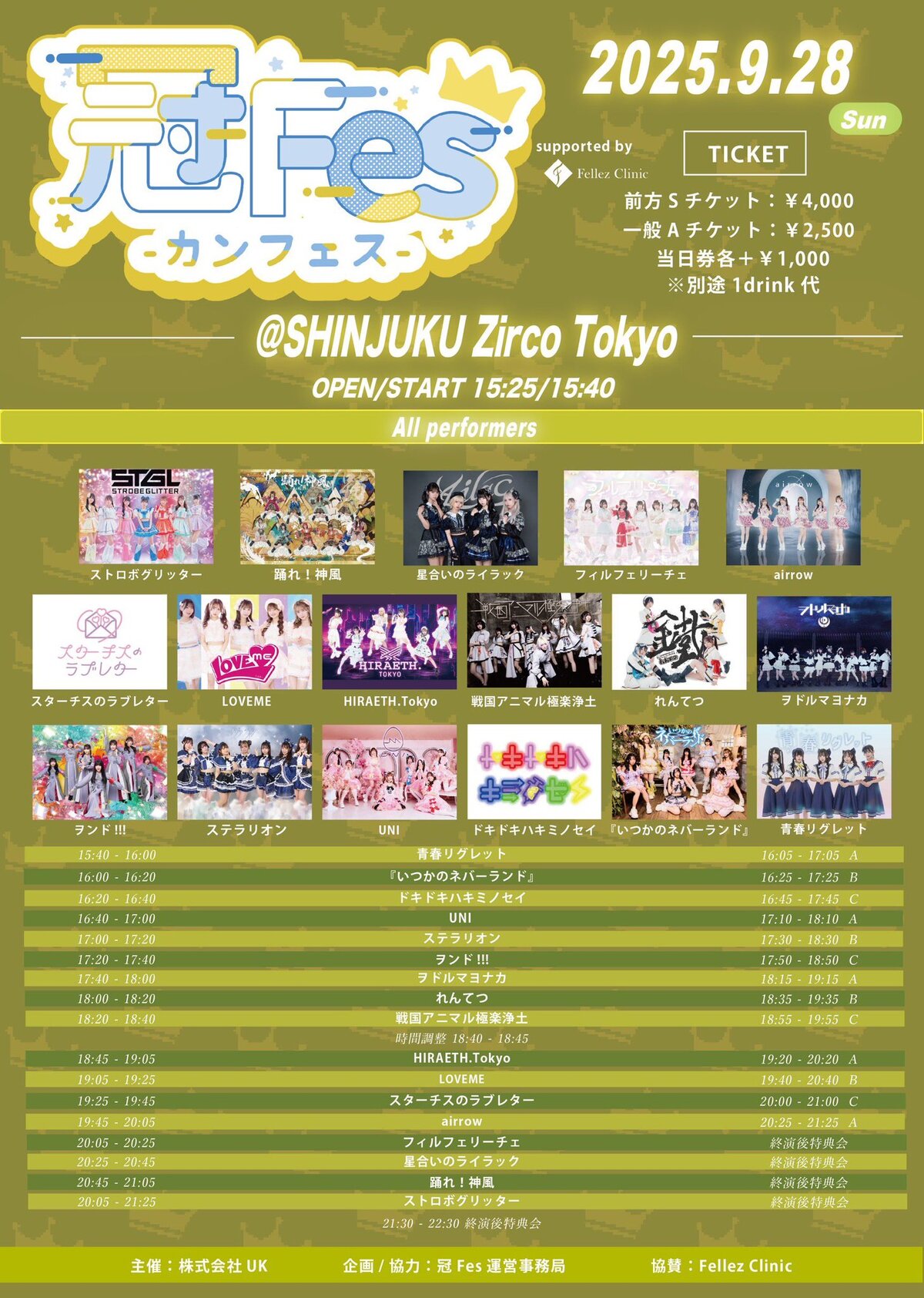 Schedule BACK TO LIST 2025.9.28[Sun] Zirco Tokyo 『冠Fes-カンフェス-』 9/28 (日) 『冠Fes-カンフェス-』 Zirco Tokyo OPEN15:25 START15:40 Sチケット4,000円 Aチケット2,500円 (入場時1ドリンク代必須) VENUE Zirco Tokyo 東京都千代田区 TIME 開場 / 0:00 開演 / 0:00 TICKET 前売 未定 / 当日 未定 ACT