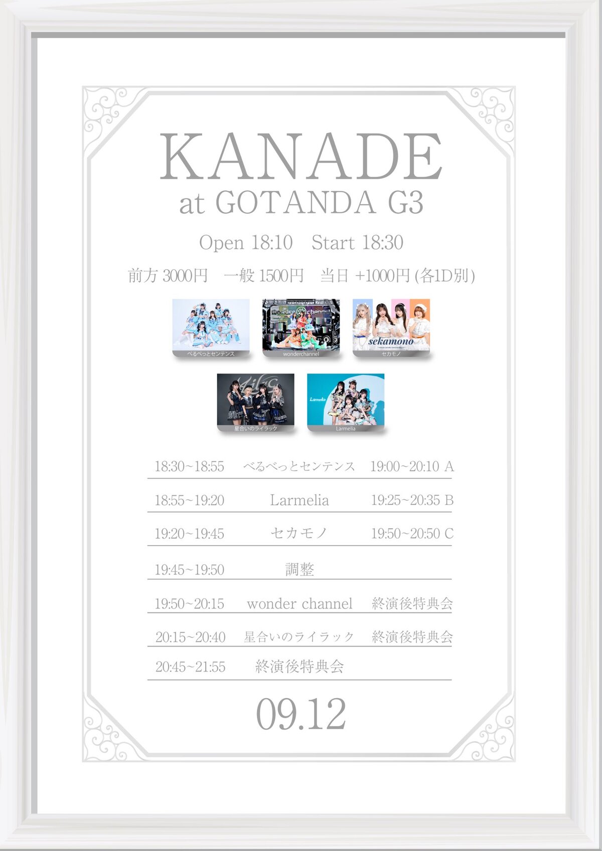 Schedule BACK TO LIST 2025.9.12[Fri] 五反田G3 KANADE 『 KANADE 』 9/12(金) 五反田G3 20:15〜20:40 20:45〜21:55 開場18:10 / 開演18:30 前方3,000円 / 一般1,500円 / 当日+1,000円 (各+1D) ticketdive.com/event/0912g3 VENUE 五反田G3 東京都品川区 TIME 開場 / 0:00 開演 / 0:00 TICKET 前売 未定 / 当日 未定 ACT
